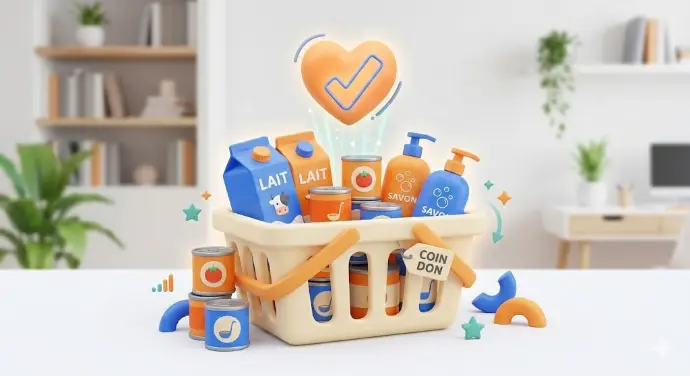 Produits Essentiels : Accès gratuit à l'alimentation non périssable, produits d'hygiène et de première nécessité.